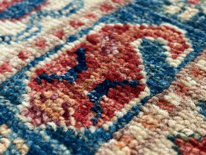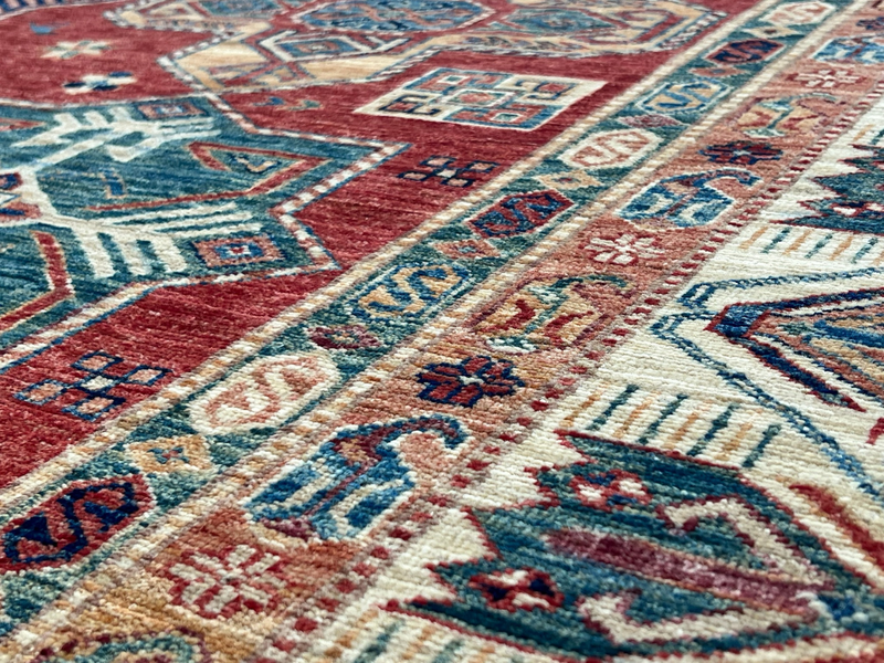 Our Ghazni Kazak rugs are woven in northern Afghanistan, mainly hand-knotted in people's homes as a supplementary source of household income. The wool is sourced from the Ghazni region, and hand-spun and dyed before going to looms for the highly skilled weavers to start work on their unique creation. Finally, once completed, the Kazak rugs are collected from the villages and cross the border to Pakistan to be washed and finished. This is where we source the Kazak rugs for our showroom - each one selected individually and in person.