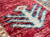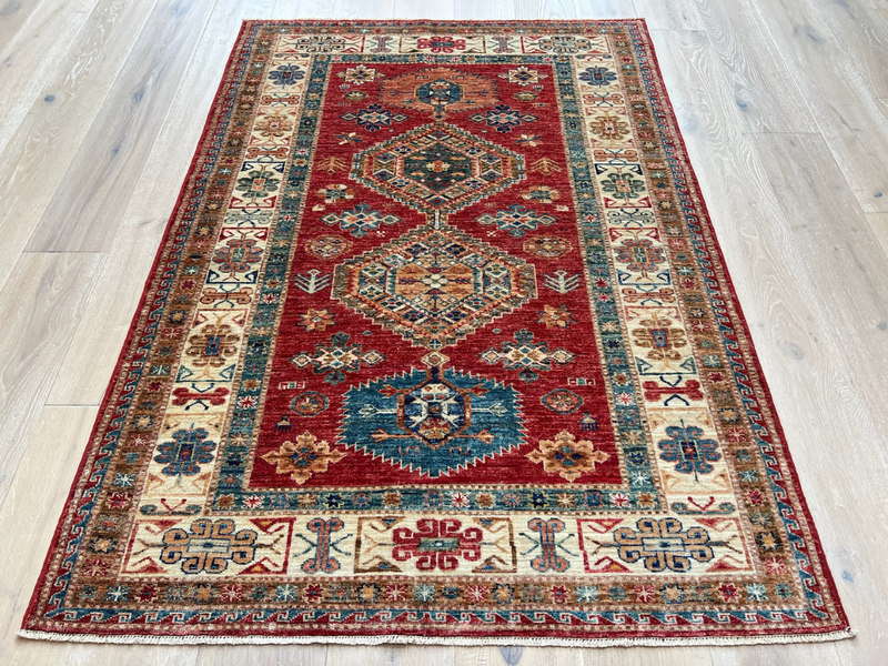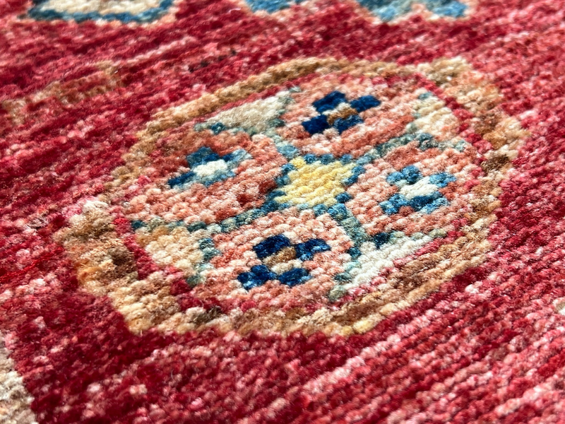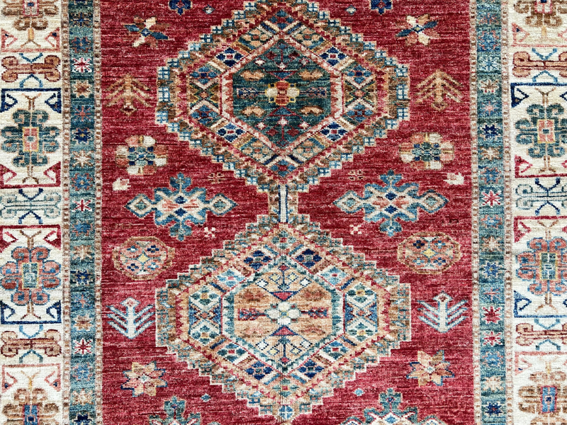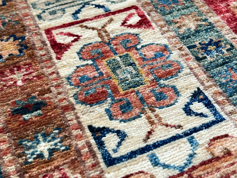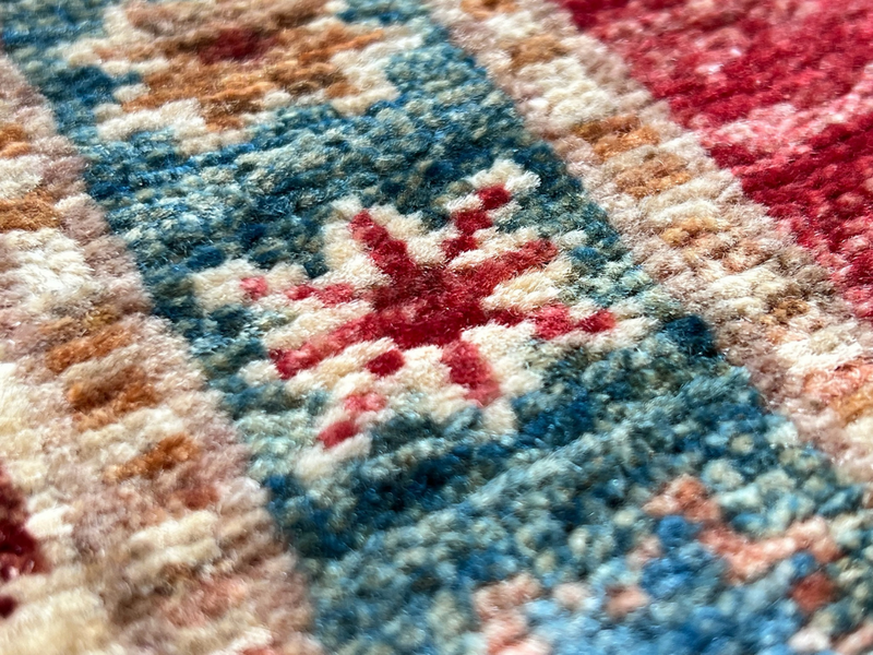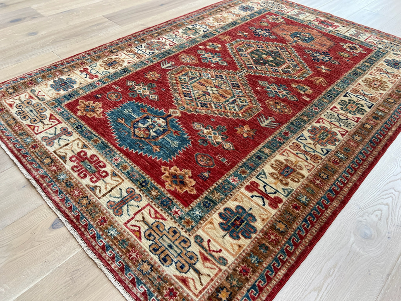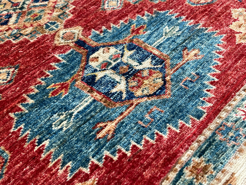 Our Ghazni Kazak rugs are woven in northern Afghanistan, mainly hand-knotted in people's homes as a supplementary source of household income. The wool is sourced from the Ghazni region, and hand-spun and dyed before going to looms for the highly skilled weavers to start work on their unique creation. Finally, once completed, the Kazak rugs are collected from the villages and cross the border to Pakistan to be washed and finished. This is where we source the Kazak rugs for our showroom - each one selected individually and in person.