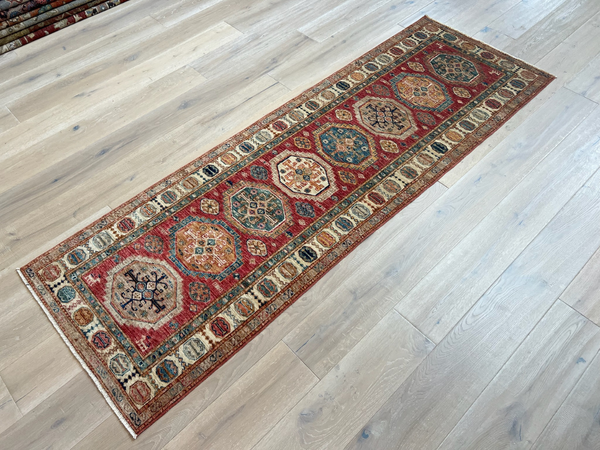 Hand woven in AfghanistanWool on wool3m x 0.76m9' 10" x 2' 6"